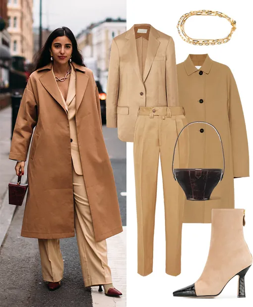 Пальто JIL SANDER, 163 923 руб.; пиджак ARJÉ, 62 761 руб.; брюки ARJÉ, 31 175 руб.; ботильоны PARIS TEXAS, 24 764 руб.; сумка STAUD, 21 166 руб.; цепочка ZARA, 1 299 руб.