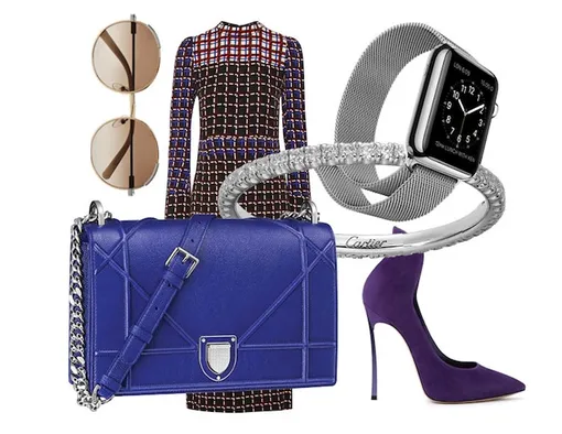 Платье, Marni; сумка, Dior Diorama; туфли, Casadei; кольцо, Cartier; очки, Chloé; часы, Apple Watch
