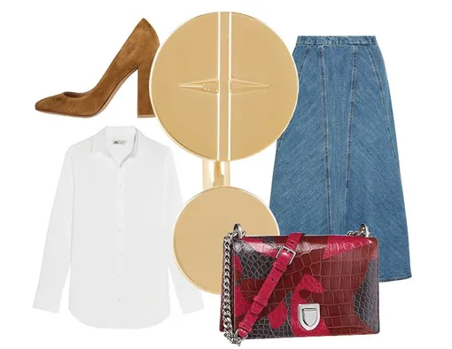 Серьги, Chloé; сумка, Dior Diorama; туфли, Gianvito Rossi; рубашка, J.Crew; юбка, Michael Kors