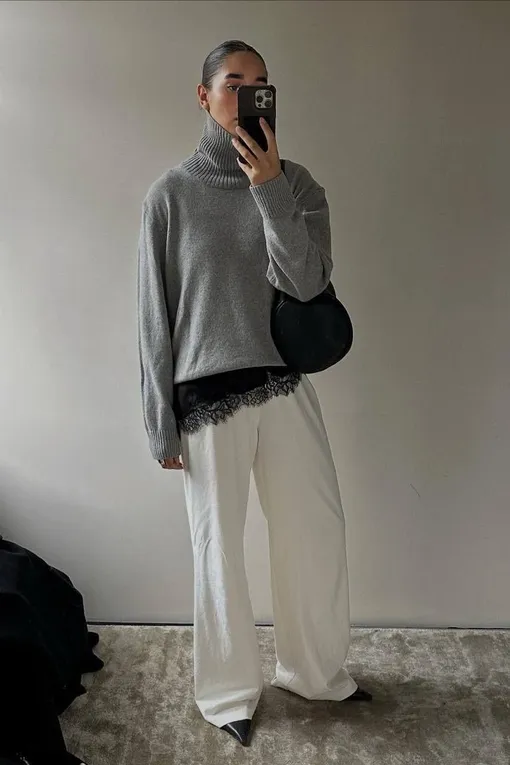 Если хочется сделать образ женственнее и элегантнее, то советуем обратить внимание на один из самых трендовых стайлинг-приемов в этом сезоне — надеть бельевой топ под джемпер так, чтобы кружевная кромка выглядывала из-под воротника или по линии низа. Такая деталь будет выглядеть очень эффектно и мгновенно преобразит образ. Что касается цветовой гаммы, то здесь возможно несколько вариантов: вы можете выбрать обе опции в одном оттенке, а можете поэкспериментировать. Отлично будет смотреться светлое кружево под темным свитером или наоборот. В этом случае оно берет на себя роль акцента и делает даже самый простой трикотаж выразительным.