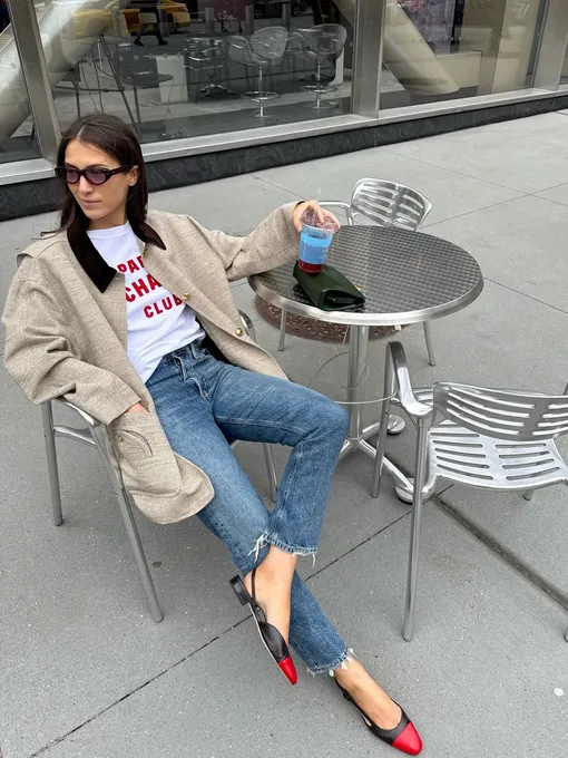 Возможно, само название не на слуху, но форма вам точно знакома. Слингбэки — это туфли с закрытым мысом и открытой пяткой, которую удерживает тонкий ремешок. Они могут выглядеть строго или нарядно, быть частью повседневного гардероба или сопровождать вечерние выходы. История этой модели началась с показа Кристиана Диора в 1947 году. Примерно тогда модный Дом, известный своей одеждой, запустил обувное направление вместе с модельером Роже Вивье. Но окончательно культовый статус этот вариант получит благодаря Коко Шанель: в 1957 году она создала бежевую пару с контрастным черным мыском. Этот двухцветный дизайн стал эталоном, и до сих пор является визитной карточкой бренда. Кстати, придумала она его из-за своего комплекса. Сегодня фокус смещается на версию без каблука. Она сохраняет элегантность классических слингбэков, но делает шаг в сторону комфорта. Закрытый носок — чаще острый или полукруглый (иногда квадратный) и открытая пятка. Ремешок может быть лаконичным или дополненным пряжкой, цепочкой, эластичной вставкой. Часто встречается глубокий V-образный вырез — он сделает линию стопы более изящной.
