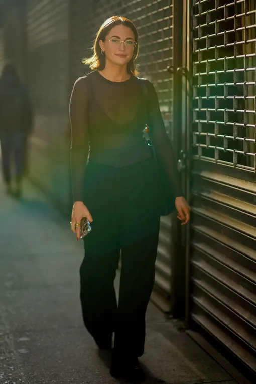 Стилизация у прозрачного лонгслива работает предельно просто. Например, черный вариант в паре с прямыми брюками того же оттенка визуально вытягивает силуэт и спокойно вписывается даже в офисный контекст, если выбрать аккуратный бюстгальтер-топ и добавить строгий жакет для баланса Но стоит заменить брюки на светлые джинсы, добавить пару украшений и тот же лонгслив сразу становится частью более расслабленного образа. Добавьте лоферы или кеды, мягкую сумку, и это уже готовый комплект на бранч с подругой. Для вечера достаточно усилить контраст: выбрать юбку-колонну или кожаные брюки, каблук и маленькую сумку, а прозрачность оставить главным акцентом, не перегружая образ лишними деталями. Лонгслив такого формата подстраивается под любой случай, поэтому это точно хорошая инвестиция в ваш гардероб. Мы собрали разные варианты прозрачных лонгсливов, чтобы вы могли выбрать свой формат.