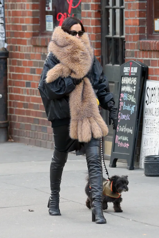 Недавний выход модели в Нью-Йорке — наглядное пособие по тому, как работает этот прием в реальной жизни. Кожаная юбка-карандаш, лаконичный джемпер и черный кожаный бомбер создают актуальную основу образа. Высокие ботфорты на устойчивом каблуке вытягивают силуэт. Когда погода требует практичности, черный цвет становится надежным союзником: тотал-блэк всегда выглядит продуманно и спокойно выдерживает любые капризы зимы. Но решающий акцент — меховой шарф. Объемный, почти как палантин, он не просто защищает от холода, а задает другое настроение. Такой аксессуар смягчает строгость кожи и добавляет фактуры. При этом шарф не перетягивает все внимание на себя, а работает как финальный штрих — именно тот, который отличает просто теплый комплект от по-настоящему стильного.