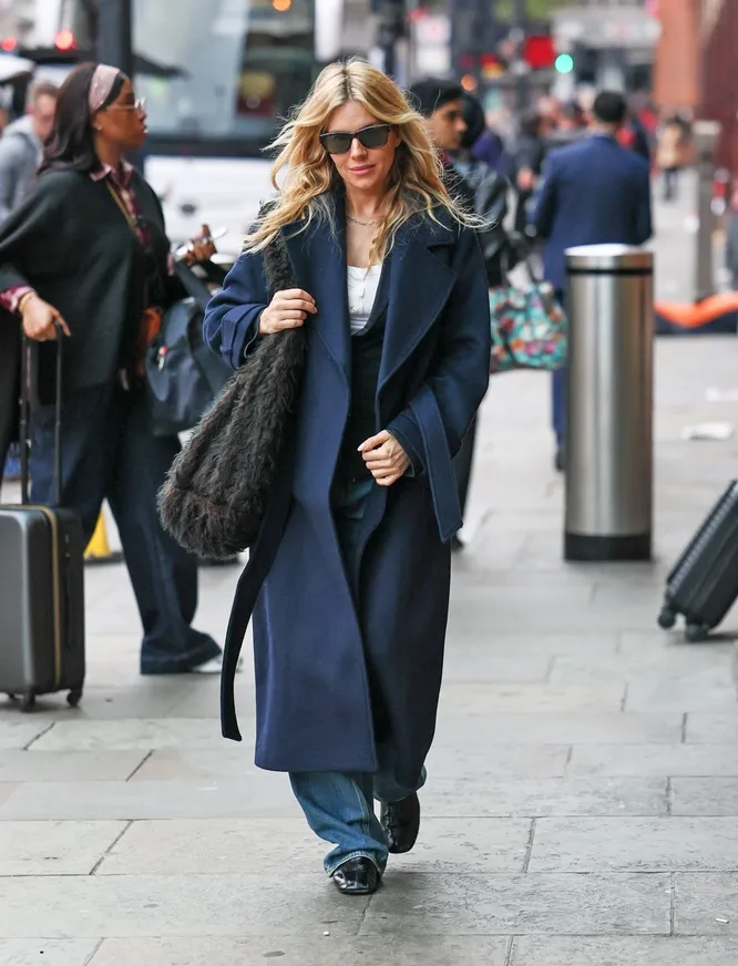 Очередь утепляться действительно дошла и до сумок. Бренды, словно сговорившись, представили меховые версии своих культовых моделей: от миниатюрных клатчей до вместительных шопперов. Тренд на «мягкие фактуры» пришел как ответ на стремление к тактильному комфорту и эмоциональному теплу. То, чего нам всем так не хватает. Ведь мех, даже искусственный, работает как своего рода терапия: его приятно держать в руках, он добавляет луку уюта и визуально смягчает даже самые строгие линии кроя. Современный мех давно перестал быть предметом этических споров. Натуральные варианты практически исчезли с подиумов, уступив место эко-альтернативам, которые выглядят ничуть не хуже, а зачастую даже эффектнее. Искусственный мех позволяет дизайнерам играть с цветом и фактурой. Такие сумки мгновенно обновляют даже базовый наряд, добавляя в него немного театральности и мягкой иронии. Но главный источник вдохновения, конечно, Сиенна Миллер. Сиенна выбрала идеальный баланс между уютом и элегантностью: темно-шоколадная пушистая сумка-хобо, свободные синие джинсы, молочный лонгслив и кожаные ботильоны. А сверху темно-синее пальто, которое станет отличным аналогом черному. Простая формула, но в ней — весь дух современной моды.