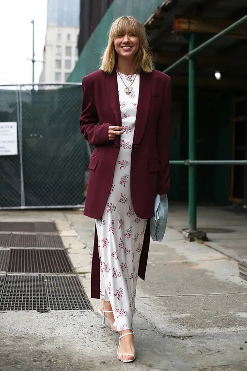 Это комбо идеально на каждый день, поскольку подходит для самых разных случаев. Романтичность и наивность цветочного платья уравновешивается строгим кроем пиджака, и в сумме выходит полностью сбалансированный образ. Отправиться в нем можно на вечеринку, в офис, на важную встречу, на романтическое свидание или ужин с друзьями. Меняйте аксессуары, чтобы сделать наряд наиболее уместным для каждого случая. Чтобы сделать образ более выходным, дополните его туфлями на каблуке и эффектной небольшой сумкой, а если отправляетесь на работу — удобными лоферами или балетками и вместительным шоппером со всеми необходимыми вещами. Решать только вам — у вас полный карт-бланш на стилизацию образа.