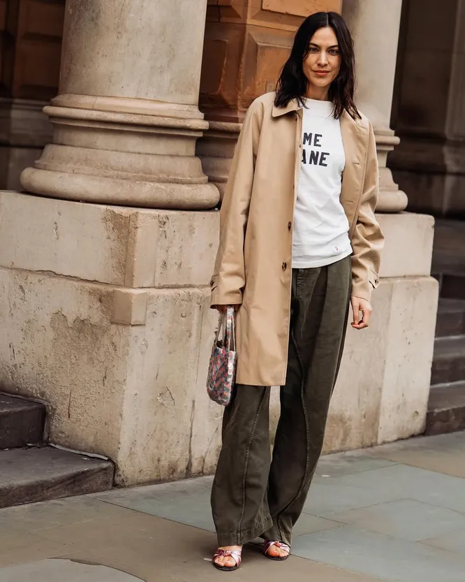 Алекса Чанг вновь подтвердила свой статус модной иконы. Ее последний образ строится на простых вещах, но работает за счет нюансов. В центре — брюки-карго, дополненные базовой футболкой. Сверху — тренч-макинтош, который делает комплект чуть более строгим. Финальные неожиданные акценты: розовые мюли на небольшом каблуке и сумка с крупными пайетками. Визуально образ кажется лаконичным, хотя в нем заложена продуманная стилистическая логика. Начнем с основы. Брюки-карго относят нас к утилитарной эстетике и рабочей униформе. И это сейчас крайне актуально. Свободный крой, накладные карманы и расслабленная посадка создают ощущение непринужденности. Если раньше такие модели ассоциировались с подростковыми луками, сегодня они легко переходят в более взрослый гардероб. Секрет кроется в сочетаниях. Футболка поддерживает баланс и не перегружает силуэт, позволяя карго оставаться главным элементом. А остальное «окружение» полностью меняет их восприятие. Отдельного внимания заслуживает тренч-макинтош. В отличие от классических вариантов с поясом, у него более строгий крой. Однобортная конструкция, скрытая застежка и чистые линии всегда актуальны. Такой тренч выглядит спокойно, но выразительно, особенно на контрасте с ненапряженным «низом».