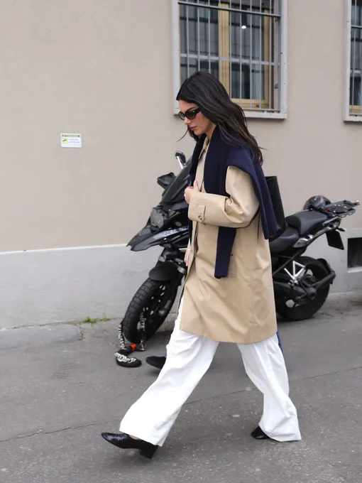 Так, например, на днях в Милане была замечена Кендалл Дженнер. Она продемонстрировала лук, который мы гарантированно захотим повторить сразу же после того, как холода пойдут на спад. Это простой минималистичный образ из классических белых брюк, аккуратных черных борфортов и свитера, накинутого на плечи. Главную роль в нем играет плащ. И не простой — а прямого кроя, в духе 60-х, который подойдет всем, кто обожает простые утилитарные вещи, легко сочетающиеся между собой. Эта модель — лучшая инвестиция в демисезонный гардероб, поскольку даже если захочется сделать легкий акцент на талии, на помощь всегда придет пояс или любой ремень из вашего гардероба.