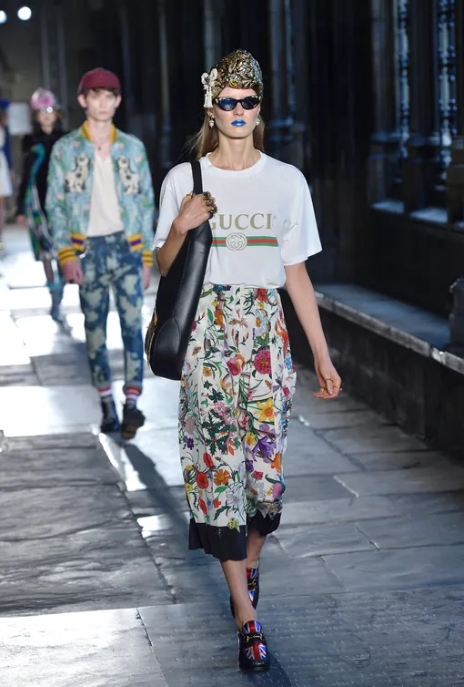 Алессандро Микеле, конечно, уникальный персонаж. Мало кому из дизайнеров удается иронизировать над прошлым на настоящим поверенного бренда с такой же непринужденностью, не стирая при этом с его наследия золотого напыления. Вспомнить хотя бы показ круиз 2017 – обратили внимание на серию футболок и толстовок с фирменной красно-зеленой полоской и логотипом? Сам Микеле уверяет, что вдохновлялся принтом Gucci образца 1980-х, что очень многозначительно, учитывая, какой непростой в плане имиджа период переживал тогда модный Дом.