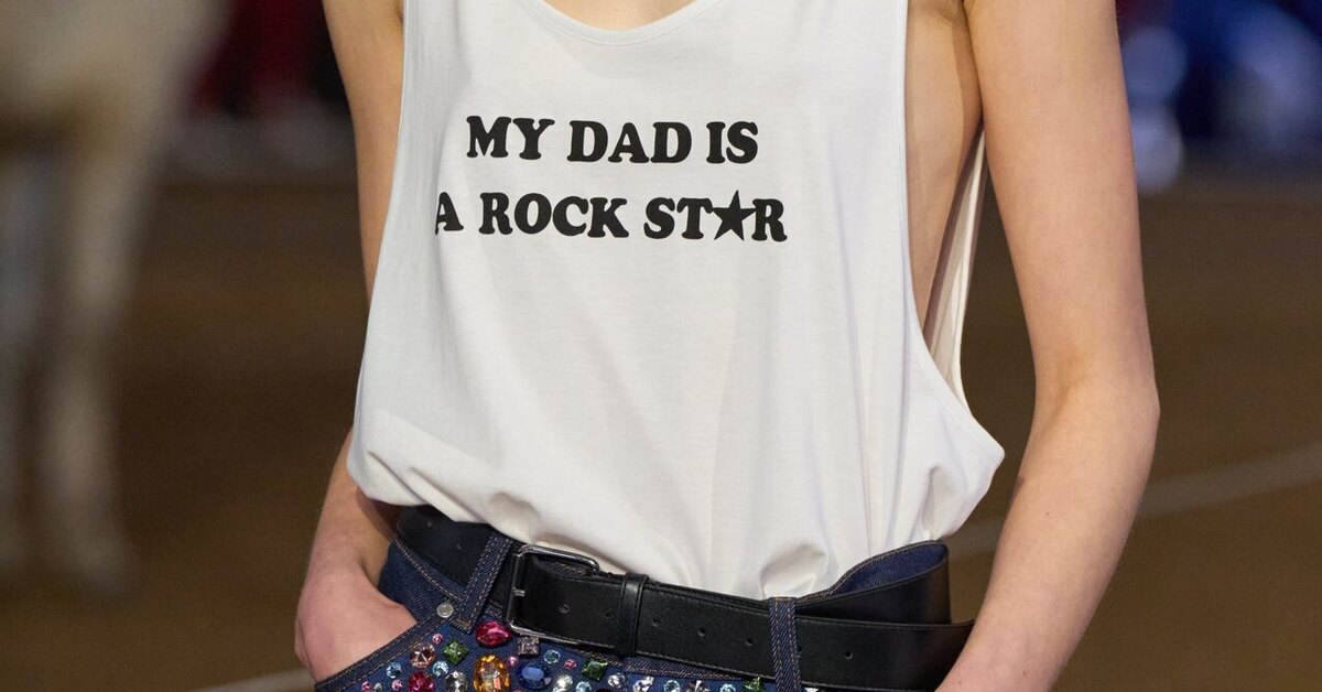 Подиум тоже поддерживает эту линию. Стелла Маккартни в одноименном бренде на шоу осень-зима 2026/27 переосмысляет весь свой дизайнерский путь. Финальный выход — модель в джинсах и майке с фразой «Мой папа — рок-звезда». Простой, но красивый жест, за которым стоит дочь, которая любит и гордиться своим папой. Что выбрать вам? Форма остается на втором плане. Футболка или майка, свободный крой или более приталенный, базовый цвет или яркий — ориентируйтесь на себя. Главное — текст. Он может быть ироничным, нежным, провокационным или очень личным. Важно одно: чтобы он совпадал с вашим внутренним ощущением.