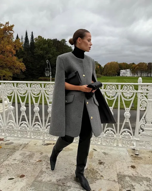 Кейп нельзя считать просто «еще одним» пальто. Это вещь с характером. Благодаря своей архитектурной форме он способен придать образу аристократичные нотки и даже в некоторых случаях заменить вечернее платье. Осенью такой вариант особенно актуален: если в вашем расписании есть мероприятия, где дресс-код требует безупречного вида, — он станет настоящей находкой. Это как раз тот случай, когда его можно не снимать. Современные кейпы играют с объемами и фактурами. Самый узнаваемый крой — это цельный отрез ткани, спускающийся от плеча и создающий эффект большого шарфа или палантина. Но не менее популярны модели с драпировками, которые красиво ниспадают по силуэту. В числе фаворитов дизайнеров — опции в пол. В тренде также серые, молочные, шоколадные и даже вариации с анималистичным принтом. Классический кейп не предполагает полноценного рукава: руки проходят через аккуратные прорези на уровне локтя. Но в актуальных коллекциях все чаще встречаются гибридные версии.
