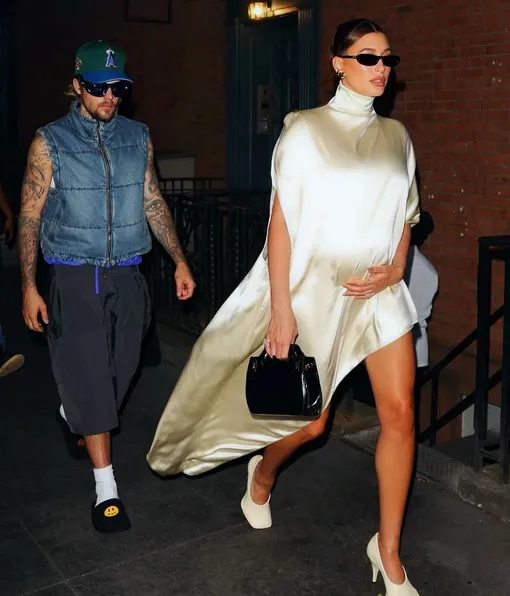 Хейли сменила сразу несколько луков. Для второго аутфита звезда выбрала белое платье от бренда Phoebe Philo. При первом взгляде на фото Бибер, может показаться, что она одета в платье миди. На деле же на знаменитости асимметричное мини из тонкого шелка со встроенным боди-комбинезоном и высоким горлом. Вы же можете выбрать любое мини из шелка или атласа. А если вы хотите добиться такого же «вау-эффекта», то обязательно выбирайте модели с асимметричным подолом. Все остальное: от длины до цвета — может быть любым. Но мы советуем вам выбирать белый. У этого цвета есть волшебная способность вписываться практически в любую обстановку, не зря этот оттенок — главный тренд сезона. Хейли дополнила наряд туфлями в тон платью, черной небольшой сумкой, классическими солнцезащитными очками и акцентными серьгами. На месте лодочек вполне органично смотрелись бы и лаконичные босоножки или актуальные балетки. Аксессуары могут сработать и наоборот: снизить градус нарядности и сделать образ более повседневным.