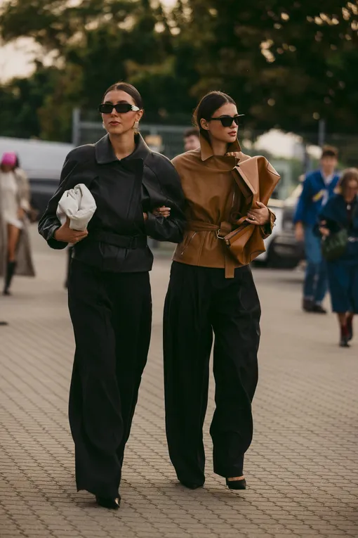 Тренды кожаных жакетов сформировались под сильным воздействием ретро-эстетики: дизайнеры вдохновляются архивами конца 80-х и 90-х, предлагая разнообразные фасоны кожаных жакетов. Да-да, именно тогда и случился бум на одежду из кожи — в то время на подиумах мы впервые увидели симбиоз высокой моды и бунтарства. И это настроение в очередной раз откликнулось брендам: на актуальных шоу можно было заметить приталенные ladylike силуэты, модели с выразительной линией плеч в духе power dressing и свободные жакеты «с мужского плеча». Цвета кожаных жакетов предлагаются как в лаконичных черных версиях, так и в более смелых решениях: от насыщенного красного до глубокого бургунди. Яркие оттенки моментально преображают привычные образы, добавляя им дерзости и современного звучания, тогда как классическая черная, коричневая или хаки опция станет идеальной базой. Если говорить о фактуре, то сам материал может быть матовым (или зернистым), лаковым или винтажным, с эффектом состаренной кожи, будто блейзер уже прожил свою насыщенную историю. Не менее важен и вопрос стилизации. Если раньше пиджак в этой фактуре воспринимался исключительно как часть повседневных луков, то теперь он уверенно выходит за привычные модные рамки. Стильные кожаные жакеты идеально вписываются в офисный дресс-код: сочетайте их с белой рубашкой и классическими брюками. Больше о том, как выбрать и с чем носить модный кожаный жакет осенью-2025, мы рассказали ниже.
