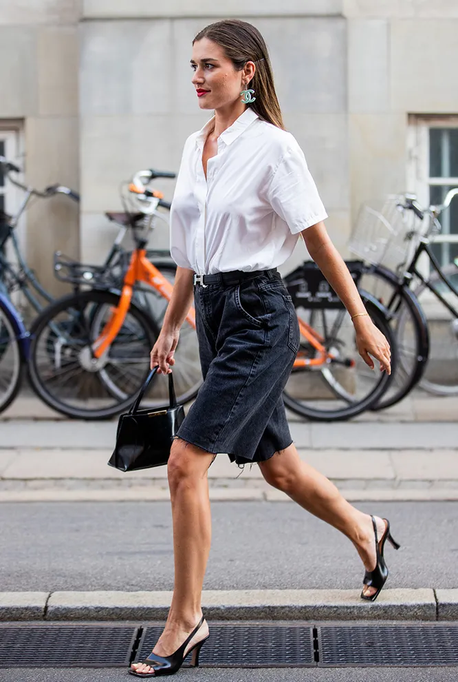 Бермуды из денима классно будут смотреться со свободными рубашками, кардиганами и ботинками челси. Адепты спортивного стиля могут надевать их с худи, базовыми футболками и кроссовками. Для кожаных шорт можно повторить офисный аутфит, как у первого варианта. Элегантные модели из веганской кожи ищите у бренда Nanushka. Также модные бермуды можно присмотреть в коллекциях Jacquemus и Stella McCartney. Шорты до колена станут выгодной покупкой, ведь они будут актуальны не только нынешней весной и летом, но и будущей осенью. Так, недавно Рикардо Тиши из Burberry представил несколько образов с бермудами в своей осенне-зимней коллекции 2021.