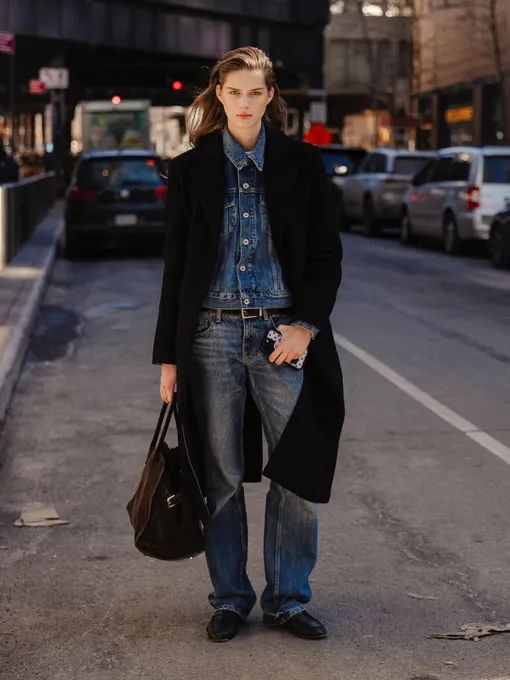 Да, речь именно о джинсовой куртке. И лучший союзник для нее — джинсы. Тотал-деним возвращается в модную повестку, напоминая о легендарном «канадском смокинге». История этого сочетания уходит в 1951 год, когда Бинг Кросби попытался заселиться в отель в Ванкувере в обычной куртке из денима и джинсах. Строгий дресс-код сыграл против него, и ситуация стала поводом для ироничного жеста от Levi's — бренд подарил певцу джинсовый смокинг. Забавная история превратилась в модный сюжет, а этот дуэт навсегда стал эффектной классикой. Весной-2026 этот прием снова звучит свежо. Куртка? Прямая, укороченная или до линии талии. «Низ»? На ваш вкус. Сейчас в тренде скинни, джинсы-клеш, буткаты или привычные широкие модели. А вот самая актуальная посадка — заниженная. Вы можете сочетать оттенки тон в тон или играть на контрасте: светлый деним с темным, черный с белым, голубой с красным. Чтобы адаптировать образ к межсезонью, добавьте верхнюю одежду — укороченную дубленку, бомбер, кожаную куртку или пальто. А когда станет теплее, замените куртку на пиджак из шерсти. Такой подход делает комплект многослойным и визуально сложным. С обувью можно действовать свободно: подойдут казаки, ботильоны, грубые ботинки на шнуровке или лаконичные лоферы. Под джинсовую куртку легко впишутся футболка, рубашка, майка или водолазка — ориентируйтесь на настроение и температуру за окном. Деним в этом случае работает как универсальная база, вокруг которой вы собираете ансамбль.