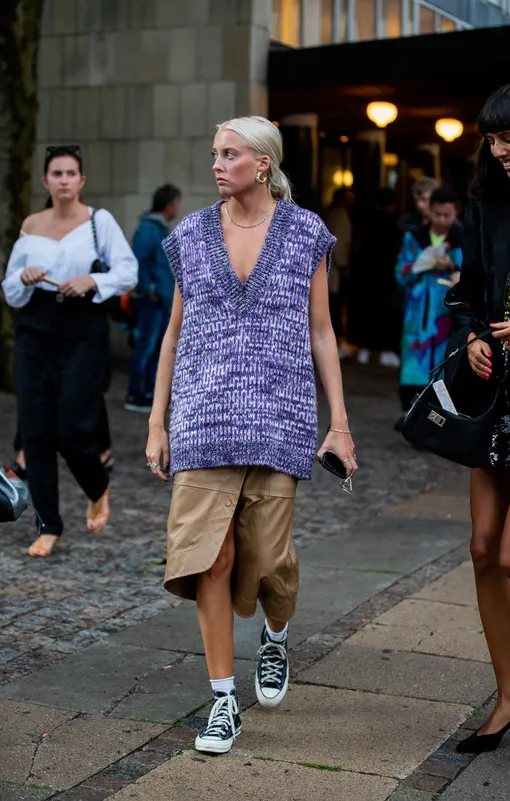 В такую совсем не летнюю погоду хочется достать с дальних полок все самые теплые вещи. Но не спешите: уютные свитеры можно отложить до наступления настоящих холодов, ведь героини стритстайла нашли им отличную замену — шерстяной жилет без рукавов. Он согреет в непогоду и станет интересным дополнением к летнему наряду. Надевайте его поверх платья, комбинезона, рубашки или же (для самых отважных) на голое тело. Смело выбирайте жилет на пару размеров больше: так он придаст образу фактуры и будет выглядеть актуально.