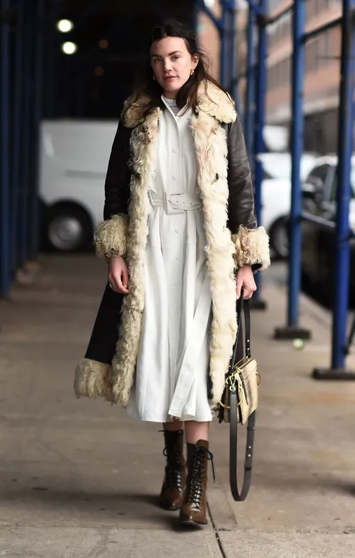 Более теплый и комфортный вариант — дубленка и массивные ботинки на шнуровке. Выбирайте обувь средней длины, чтобы она не резала ногу, и обязательно надевайте колготки — в новом сезоне дизайнеры представили множество вариантов на любой вкус. Подбирайте их под цвет обуви, чтобы визуально удлинить ногу, или же пусть будут яркого цвета с принтом, чтобы разбавить образ.
