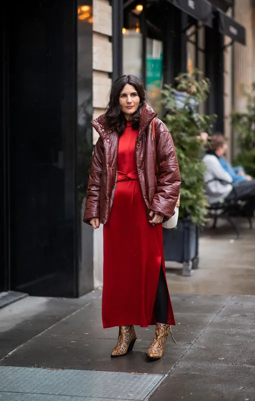 Комбинация для смелых — платье длины макси и короткий дутый пуховик. Для такого наряда можно выбрать короткие ботильоны на небольшом каблуке, укороченные казаки или ботильоны-носки. Создайте монохромный наряд, подобрав платье и куртку в одной цветовой гамме, и сделайте акцент с помощью животного принта обуви — образ получится сложным и запоминающимся.