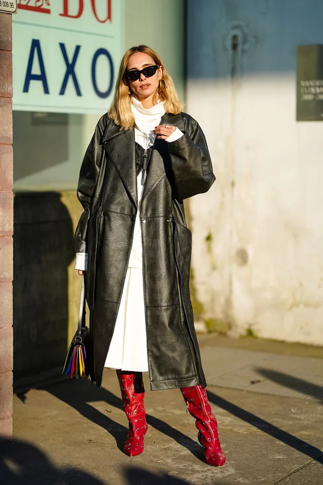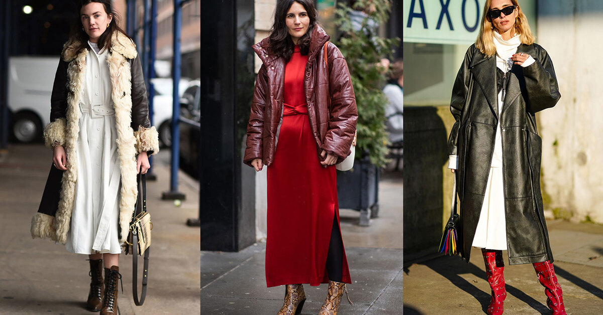 Зима вовсе не повод откладывать любимые платья в дальний угол и переходить на более практичные и удобные вещи. Главное — научиться гармонично сочетать их с верхней одеждой и обувью. Беспроигрышная комбинация — трикотажное свободное платье длины миди с высокими сапогами на каблуке и кожаным плащом, закрывающим платье. Если образ в базовых оттенках кажется вам скучным, добавьте акцент с помощью яркой обуви красного или бордового цветов.