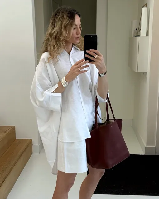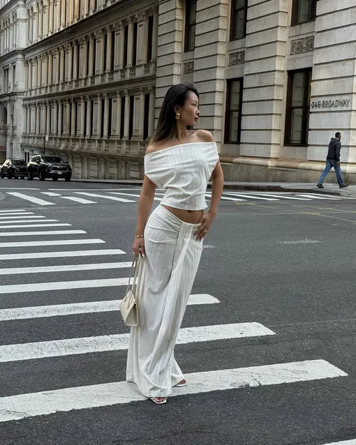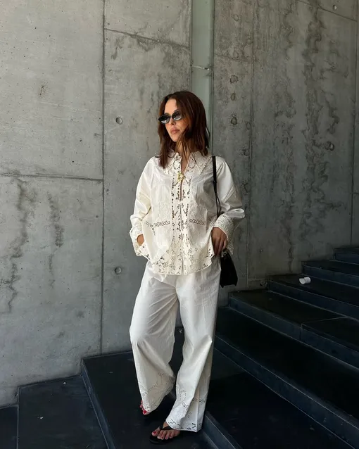 Белый цвет может выглядеть плоско, если он представлен в одном и том же материале. Поэтому главный секрет — в текстуре. Сочетайте разные ткани: например, рубашку с английской вышивкой broderie anglaise и свободные брюки из хлопка. Или примерьте образ, где соединяются белый лен (топ) и деним (юбка или джинсы) — это не только визуально разнообразит наряд, но и сделает его комфортным даже в +30. Чем интереснее микс материалов, тем «дороже» и сложнее выглядит финальный ансамбль.