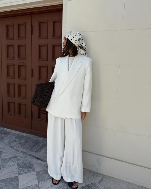 Белый — отличный холст, а значит, он нуждается в акцентах. Добавьте изящный белый шелковый платок — наденьте его на манер косынки, как было актуально в 70-х, повяжите его на пояс или пусть он обвивает ручку сумки. Еще одно простое и функциональное решение — сумка. Например, из рафии. Главное — не перегружать, но и не оставлять образ «пустым». А если вы боитесь переборщить, воспользуйтесь «правилом 7 баллов» — формула, которая способна упростить процесс сборов и поможет составить идеальный аутфит.
