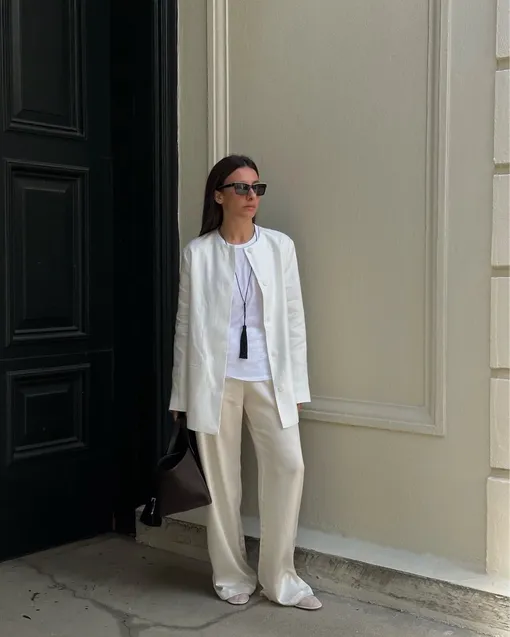 Белый — это не один цвет, а целая палитра. От кипенно-белого до кремово-белого — у каждого оттенка свой характер. Чтобы белый лук «зазвучал», не бойтесь играть на полутонах: например, белоснежную футболку миксуйте с молочными брюками и сливочным жакетом. Контраст будет мягким, но заметным.