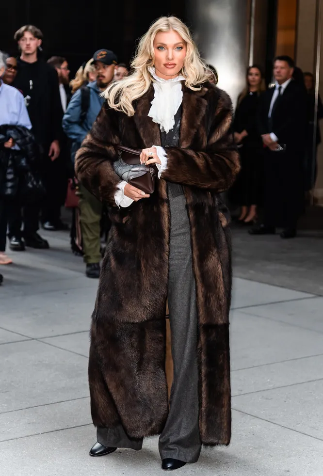 Вдохновение для зимних образов мы нашли именно у нее. Модель в этом сезоне выбрала роскошную длинную шубу из искусственного меха теплого шоколадного оттенка. Образ получился одновременно сдержанным и эффектным — тот самый баланс, который делает стиль по-настоящему дорогим. Интересно, что Хоск не пытается «приглушить» мех базовыми вещами, как это делают многие. Напротив, она сознательно подчеркивает его статусность, сочетая с женственными элементами. А именно: блузой с жабо, шерстяным кардиганом и классическими серыми брюками свободного кроя. Она дополнила дуэт черными ботильонами и небольшой сумкой. И, конечно, не забудьте про украшения. В этом сезоне их носят даже поверх верхней одежды. Получается образ с отсылкой к старому Голливуду, но в современном исполнении. Это не повседневный лук, но идеальный вариант для выхода: например, в театр или на ужин в ресторан.