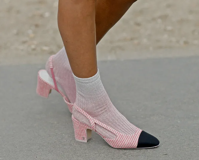 Не спешите удивляться: это не наша причуда и жажда экспериментов ради экспериментов, а набирающий силу модный тренд. Его уже который сезон эксплуатируют главные модные инфлюенсеры мира — а значит, есть смысл попробовать и вам. С плотными трикотажными носками (или даже обычными белыми) будут отлично сочетаться мюли, босоножки, туфли, слингбэки, клоги, «кроксы», балетки и даже шлепанцы и сандалии. Такое сочетание добавит любому образу нужную долю эксцентричности и создаст эффект контраста между изящной обувью и простым носком. К тому же в этом есть нечто трогательное и инфантильное, ведь обувь поверх носочков часто носят дети. А кто из нас сейчас (да и всегда, что уж там) не хотел бы ощутить себя радостным и беззаботным ребенком?