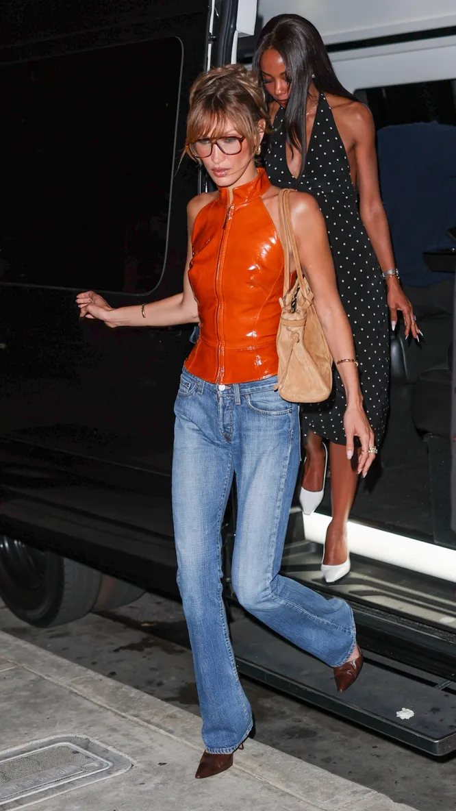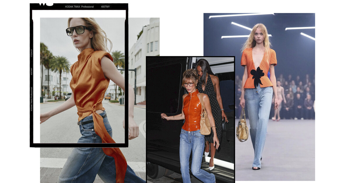 Оранжевый — цвет с характером. Он энергичный, заметный, и не всегда раскрывается сразу. Чаще всего он красиво работает с теплым подтоном кожи, усиливая естественное сияние. Да, мы не верим в теорию цветотипов и не делим людей на «осень» и «зиму», но в ней есть рациональное зерно. Поэтому самый верный путь — обязательно примерить вещь перед покупкой. Разные оттенки дают разный эффект, и среди них точно найдется ваш. Самый точный способ подружиться с этим цветом — собрать простой, но выверенный дуэт. Начните с топа и джинсов. Оранжевый «верх» и деним — от насыщенного синего до светло-голубого — создают нужный баланс между выразительностью и спокойствием. Сам топ может быть любым. Трикотажный — для повседневных образов. Шелковый или атласный — для более нарядных. А кожаный добавит дерзости. Обратите внимание на детали: драпировка, воротник-халтер, рюши или версия в технике кроше задают разное настроение и помогают адаптировать эту вещь под себя. С джинсами все еще проще: просто берите те, что у вас уже есть. Прямые, джинсы-клеш, свободные, зауженные или буткаты — оранжевый легко подстраивается под любой силуэт. Деним «собирает» аутфит и не дает цвету выйти из-под контроля.