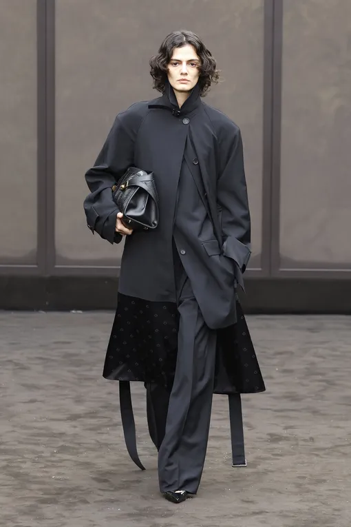 Третий прием — один цветовой акцент. Это самый простой, но при этом очень выразительный ход. Бренд Ferragamo дополнил строгий черный костюм желтыми туфлями-лодочками, а Balenciaga предложил сочетать черный монохром с кожаными перчатками оттенка фуксии. Такой контраст работает как точка притяжения и добавляет луку индивидуальность, не разрушая общей гармонии. На какие еще тона обратить внимание? Например, на трендовый фиолетовый или оранжевый. Или вы можете добавить к аутфиту белую сумку. Тотал-блэк в новом сезоне остается символом элегантности, но звучит иначе. Он строится на деталях и точечных акцентах. Такой подход позволяет сохранить сдержанность черного цвета и одновременно раскрыть его потенциал.