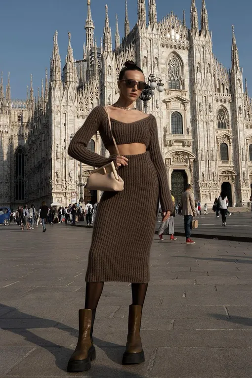 В этом сезоне самый стильный способ носить трикотажные юбки — комбинировать их с укороченным трикотажным топом в тон. Такие костюмы можно встретить, например, в коллекциях Fendi и Loro Piana. Советуем дополнить образ грубыми ботинками или высокими сапогами — не бойтесь экспериментировать с цветом и выбирать яркие пары, которые оживят ваш наряд и сделают его еще более эффектным.