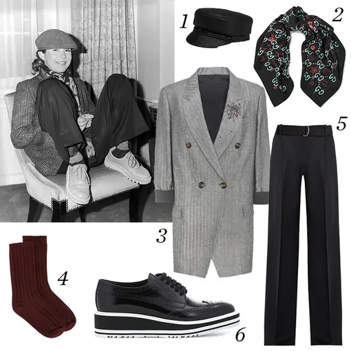 1. Кепи, Eugenia Kim. 2. Шарф, Gucci. 3. Жакет, Brunello Cucinelli. 4. Носки, Rochas. 5. Брюки, Max Mara. 6. Ботинки, Prada.