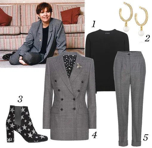 1. Джемпер, The Row. 2. Серьги, Oscar de la Renta. 3. Ботильоны, Saint Laurent. 4. Жакет, Dolce & Gabbana. 5. Брюки, Dolce & Gabbana.