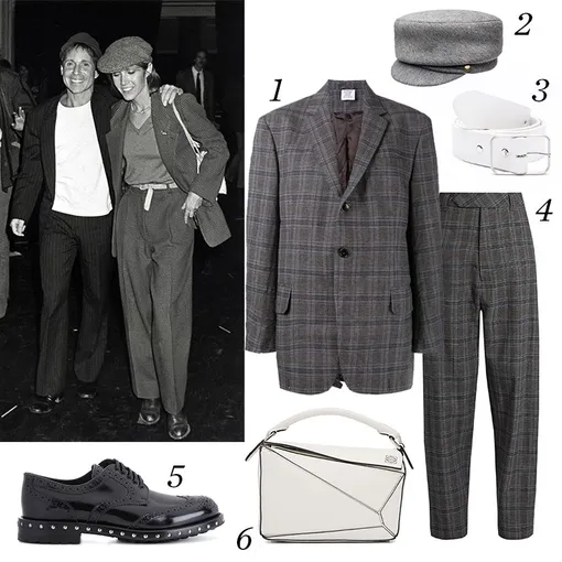 1. Жакет, Vetements. 2. Кепи, Eugenia Kim. 3. Ремень, Amaury. 4. Брюки, Vetements. 5. Ботинки, Dolce & Gabbana. 6. Сумка, Loewe.