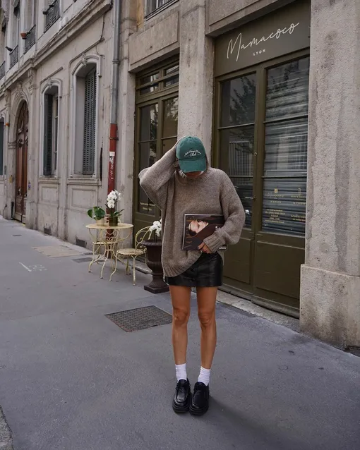 Оверсайз-свитер и мини-юбка вступают в своеобразный симбиоз: объемный закрытый верх не позволяет юбке выглядеть слишком вызывающе, а короткий низ не позволяет свитеру сделать силуэт бесформенным. Юбка может быть шерстяной, кожаной или из плотного костюмного хлопка — смотря, что найдется в вашем гардеробе. Комбинировать такой наряд можно с любой обувью: от лоферов до ботфортов на устойчивом каблуке.