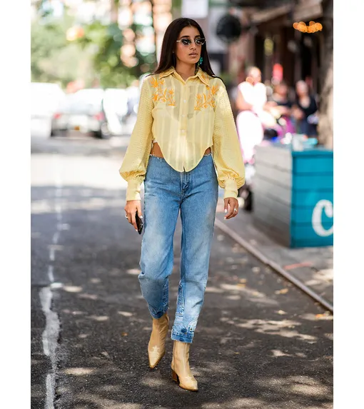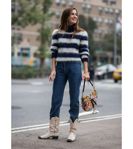 Широкие джинсы как нельзя лучше будут выглядеть с сапогами в ковбойском стиле. Скошенный каблук, острый мыс, контрастная расцветка — отличное дополнение любого базового образа.