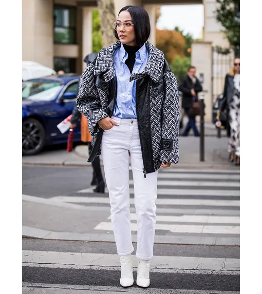 Белые джинсы — маст-хэв не только этого лета, но и грядущей осени. Вот только с подбором обуви здесь стоит быть аккуратнее: лучше всего подобрать пару такого же светлого оттенка — тогда получится гармоничный тотал-лук.