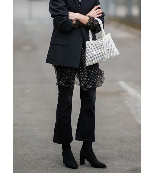 Укороченные джинсы, расклешенные от колена, отлично будут смотреться с ботильонами, плотно облегающими щиколотку.