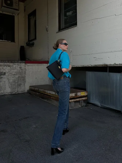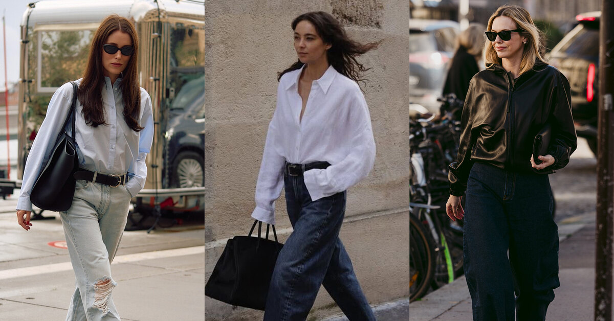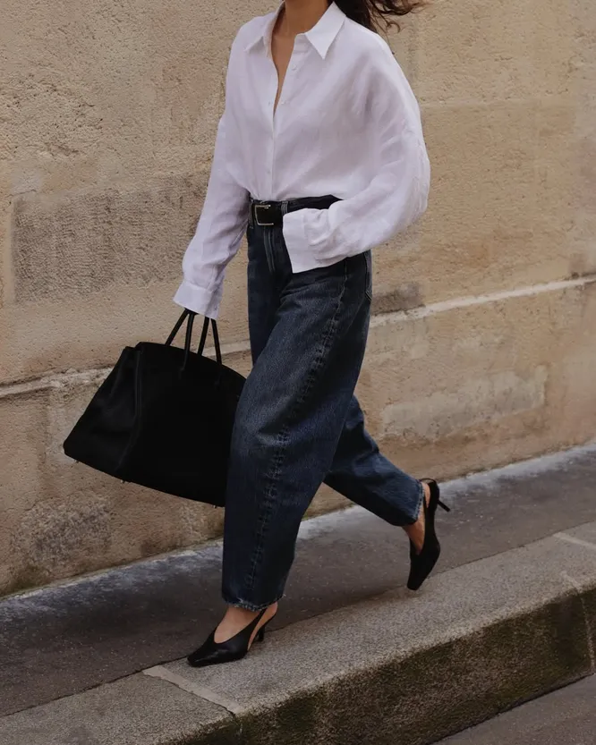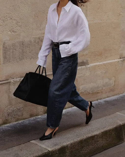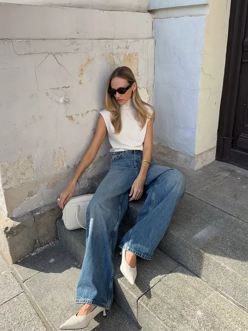 Широкие джинсы и каблуки — союз, который сначала вызывает сомнения, а потом становится любимым. Важен баланс: вместо экстремальной шпильки — аккуратный каблук-рюмочкой. Он добавляет изящества, не споря с объемом «низа». Усилить эффект помогут светлые оттенки обуви и аксессуаров: лук сразу становится легче и свежее.