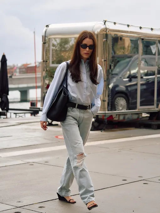 Рваные джинсы снова в центре внимания, и стилизовать их можно гораздо более изысканно, чем раньше. Заправьте в них рубашку, добавьте классический черный ремень, а дальше — комфортная обувь. Босоножки на танкетке поддержат расслабленное настроение и соберут комплект воедино. И ни намека на подростковую небрежность.