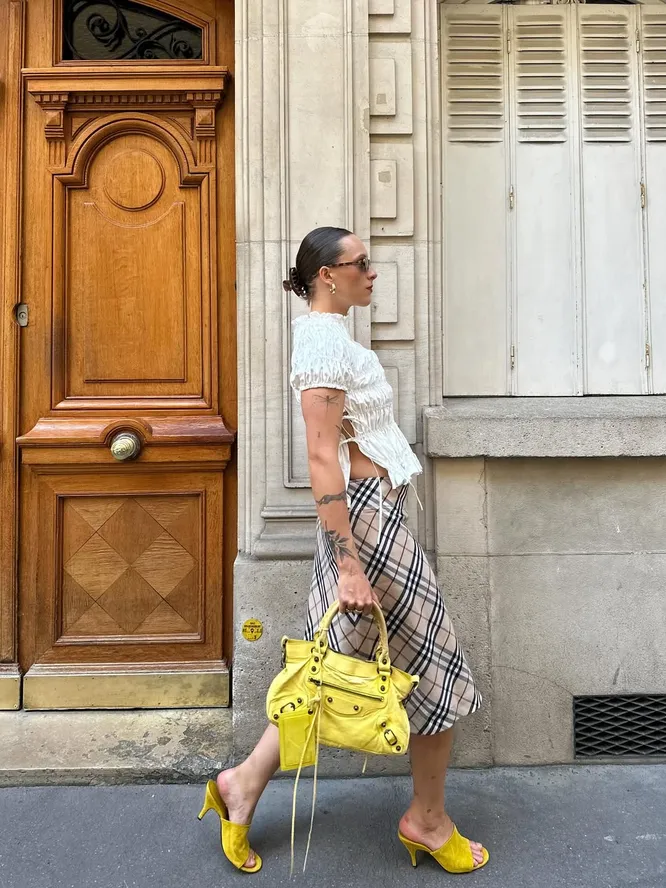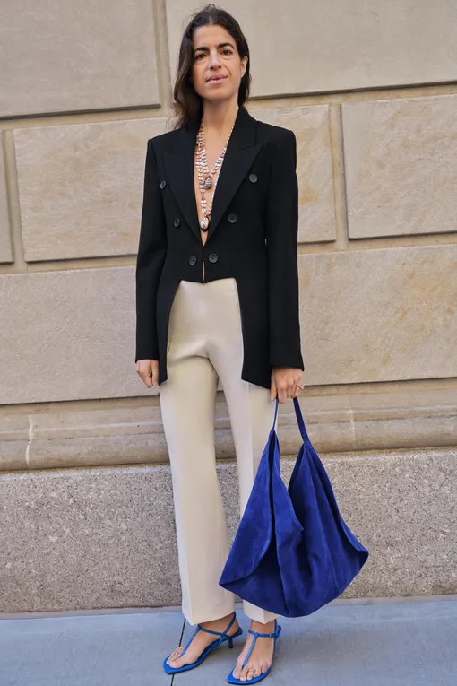 Мода циклична, и именно поэтому то, что казалось устаревшим, снова начинает звучать актуально. Только теперь с другим настроением. Речь уже не про предсказуемые комбинации вроде черного с черным или коричневого с коричневым. Интерес смещается в сторону более выразительных решений. Красный, насыщенный желтый, электрический синий, бордовый или даже золото — такие сочетания сразу притягивают взгляд и задают тон всему образу. Более спокойный вариант для теплого сезона — белый. Он работает мягко и чисто, не перегружая образ. Сумка-кисет и босоножки, аккуратная модель на плечо и туфли-слингбэки, шопер и сандалии — комбинации могут быть любыми. Важна не форма, а совпадение цвета. Именно оно создает цельность лука. И если хочется усложнить наряд, поиграйте с фактурами. Гладкая кожа, с анималистичным тиснением, замша, лак — один и тот же цвет может звучать по-разному. За счет этого появляется глубина, даже если палитра остается предельно сдержанной. Еще один нюанс — оттенки внутри одного цвета. Они могут совпадать идеально или отличаться на полтона. Во втором случае образ выглядит более живым и менее «составленным по инструкции».