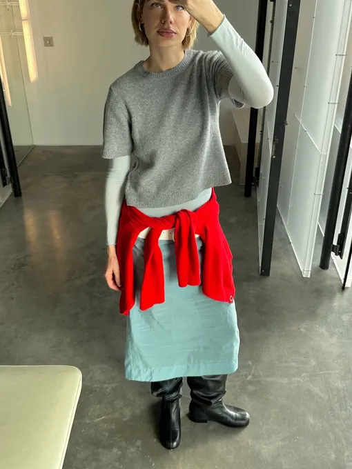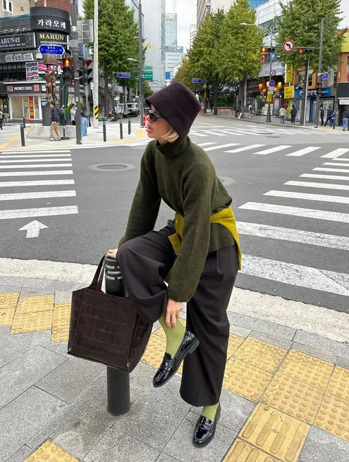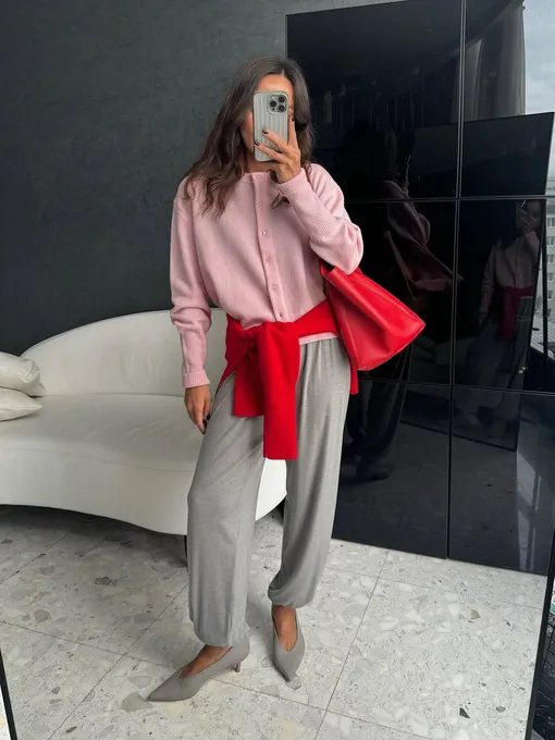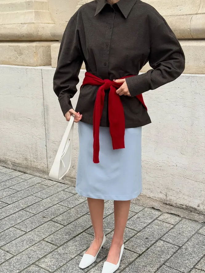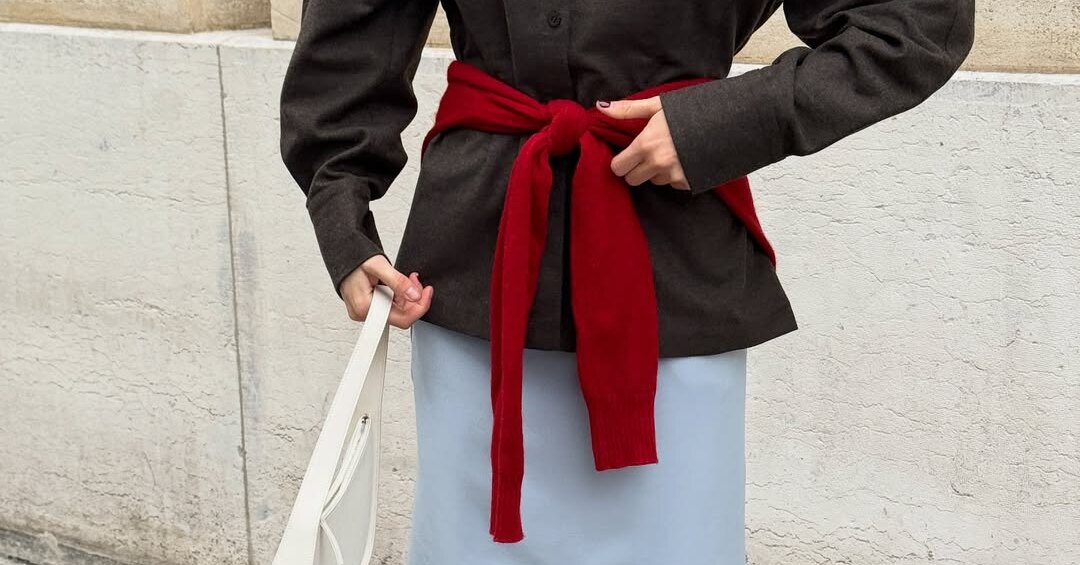 Речь о свитере, повязанном на талии. Этот жест выглядит непринужденно, но работает сразу в двух направлениях. Во-первых, формирует силуэт и мягко подчеркивает линию талии. Во-вторых, добавляет образу цветовой акцент — тот самый штрих, который собирает все воедино. Схема проста: свитер или джемпер завязывается на талии поверх основного комплекта. Это может быть рубашка, тонкий трикотаж, кардиган или даже олимпийка. Сверху — тренч или легкая куртка, если хочется многослойности. Такой прием легко вписывается в повседневные образы и не требует сложных комбинаций. «Низ» вы выбираете по настроению. Юбка, платье, брюки или джинсы — ограничений нет. Важно лишь одно: свитер становится акцентом, а не случайной деталью. И здесь на первый план выходит цвет.