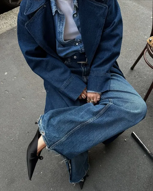 Еще один тренд, который не теряет актуальности, — сочетание разных оттенков денима. Total denim давно вышел за рамки классических сочетаний, и теперь смело можно комбинировать светлый и темный деним, серый и голубой, а также добавлять в такие тандемы третий элемент. Главное правило — выбрать вещи, которые отличаются на пару тонов, чтобы образ выглядел сбалансированным.