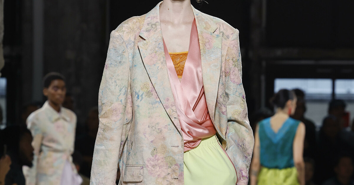 Сочетать пастельные оттенки можно совершенно по-разному — будь то нежные нюансы в одном ансамбле или смелые эксперименты с контрастами. Главное — выбрать правильные комбинации, которые подчеркнут ваш стиль. Один из наиболее выигрышных приемов — сочетание двух тонов с принтом. Этот вариант позволяет добавить образу глубины, а также избежать чрезмерной «сахарности». Например, рассмотрит лук бренда Dries Van Noten: мы видим нежно-розовый топ и сливочно-желтую юбку. Сверху на модели был накинут пиджак с мягким цветочным принтом. Здесь важно соблюдать баланс: чем более спокойные цвета, тем выразительнее может быть рисунок. А также можно добавить акценты: яркий топ и сумку со змеиным узором, как это сделали дизайнеры марки. Но и без этих выразительных деталей аутфит сработает.