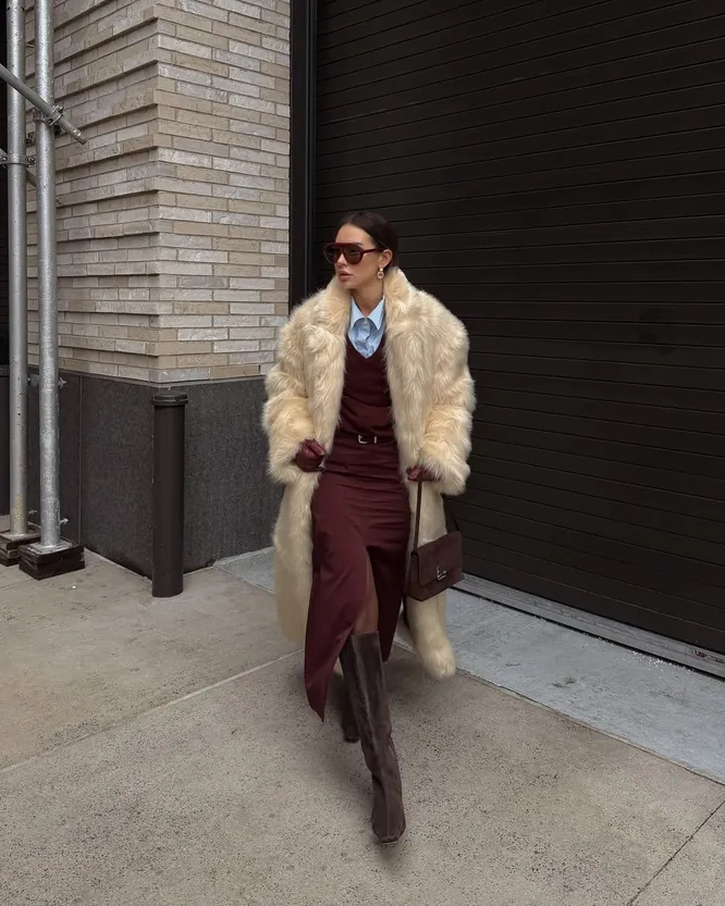 А вот для вечерних выходов стоит сделать шаг в сторону выразительности. Достаточно заменить дневную «униформу» на платье и добавить высокие сапоги или ботфорты. К примеру, отправляясь на корпоратив, накиньте ее поверх комбинации или красного платья. И не забудьте про колготки. А «усилить» лук можно красивой бижутерией. В эпоху стремительно сменяющихся трендов длинная шуба становится безопасной инвестицией и символом модной осознанности. Она не просто согревает — она структурирует всю зимнюю капсулу, предлагая редкое сочетание эстетики, функциональности и универсальности.
