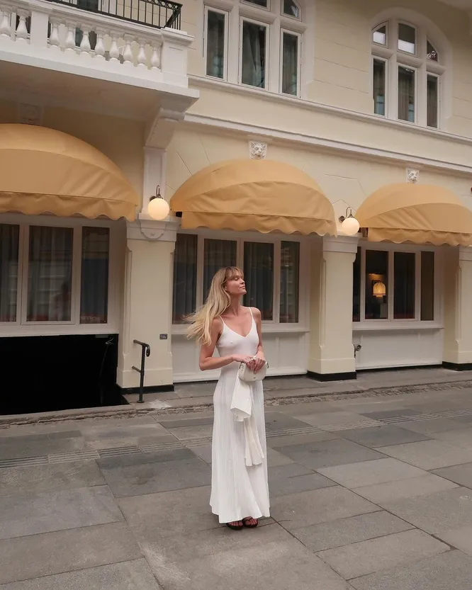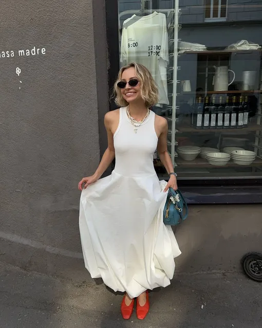 Главный цвет сезона, бесспорно, красный, но не меньшего внимания заслуживает и белый. Конечно, несколько сложно назвать этот оттенок трендом, ведь он, как и черный, всегда остается вне времени и тенденций. Однако белый стал настолько популярным в весенне-летнем сезоне 2024 года, что не обратить на него внимание просто невозможно! Также огромным его преимуществом является легкость в сочетании: благодаря своим ахроматическим свойствам белый цвет подходит ко всему. Именно поэтому отличным способом разнообразить образ с лаконичной белой моделью станут акцентные аксессуары. Так, дополните платье-майку красными балетками и небольшой голубой сумкой. Не бойтесь экспериментировать. Лето — это всегда про легкость и игривость.