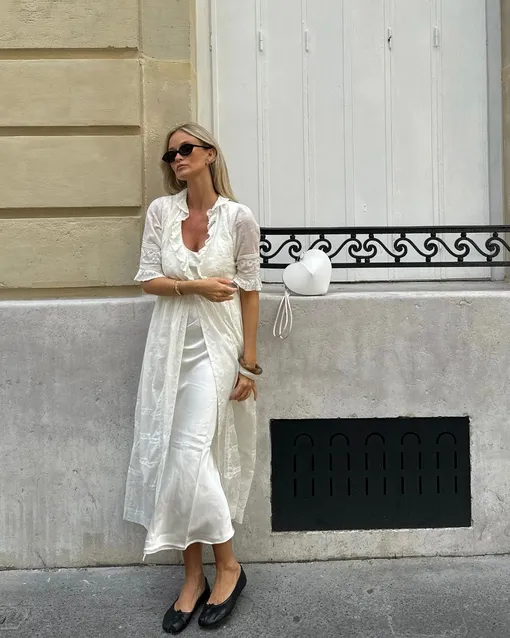Многослойность — стильный модный прием. Конечно, им довольно сложно пользоваться летом, но это возможно. Например, вы можете примерить белую шелковую комбинацию, а сверху накинуть длинный топ с рукавами фонариками. Получится очень женственное сочетание. Плюс вы спрячете плечи от палящего солнца. А комбо кружева и шелка выглядит невероятно романтично и нежно.