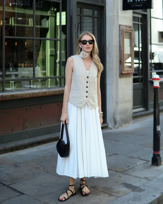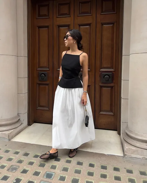 В первую очередь стоит обратить внимание на материал. Юбка должна быть из легкой ткани, вроде хлопка, шелка, вискозы или льна — в такой вам точно будет комфортно в жару. От разных принтов мы бы рекомендовали отказаться: они сделают юбку менее универсальной, а еще могут в любой момент выйти из моды. Так что беспроигрышный вариант — однотонная модель. Причем, она может быть любого оттенка белого: от нежного молочного до яркого кипенно-белого — все зависит от ваших предпочтений. Ее фасон смело выбирайте на свой вкус. Но среди наиболее популярных в 2024 году особенно выделяется юбка А-силуэта: сейчас фотографии в такой можно заметить на странице практически каждого фэшн-инлюенсера. Все дело в том, что она здорово скрывает широкие бедра и другие возможные недостатки фигуры. Не менее стильно будет смотреться и пышная юбка-баллон, актуальная уже не один сезон. Правда, носить такие модели лучше всего с приталенным или прямым «верхом»: так у вас получится сохранить пропорции силуэта. А визуально удлинить рост поможет обувь на каблуке: классические лодочки, изящные слингбэки или открытые босоножки. Не стоит списывать со счетов и вновь вернувшиеся на подиумы плиссированные юбки — такие здорово впишутся в аутфиты в стиле «теннискор».