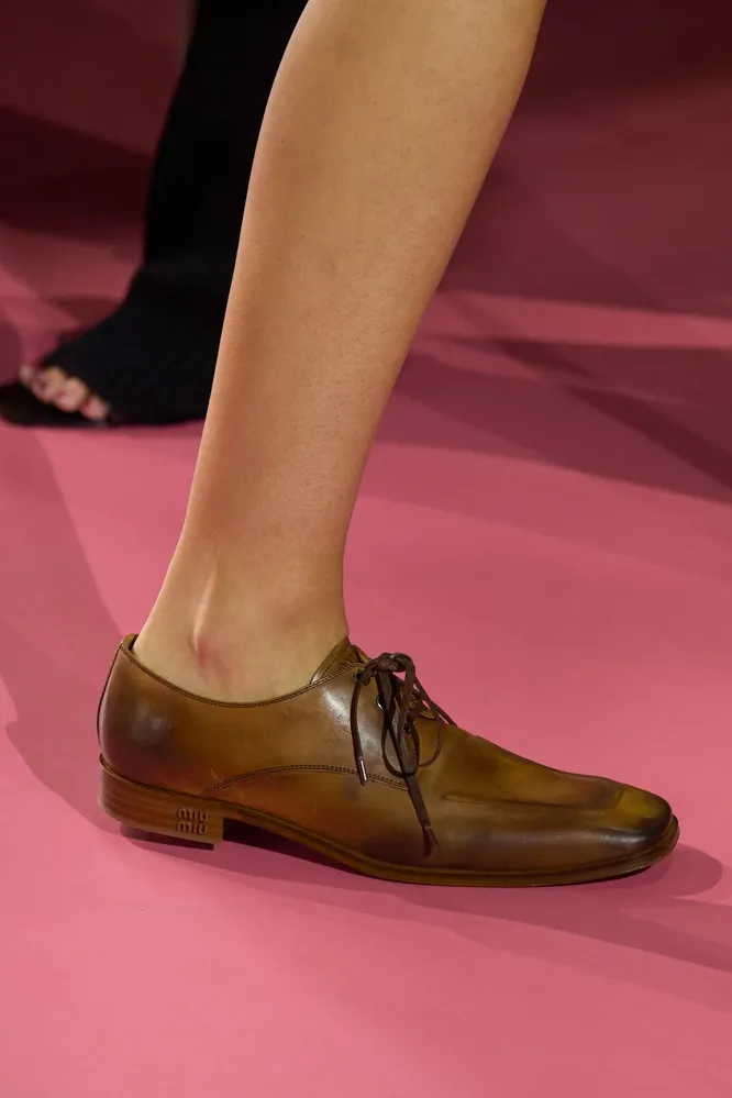 Более нишевые «коллеги» лоферов — это оксфорды. От первых эти удобные пары отличаются шнуровкой и тонкой подошвой, которая позволяет избавиться от громоздкости и нарочитой строгости в комплекте. Эти модели также лучше выбирать только если обувь может похвастаться классической расцветкой. Однако есть некоторые послабления — например, налет винтажности, которого можно достичь благодаря нарочито-потертому внешнему покрытию (лучшим референсом станут пары, как у Miu Miu). Однако и более базовые черные варианты также будут отлично работать в корпоративных или расслабленных образах.