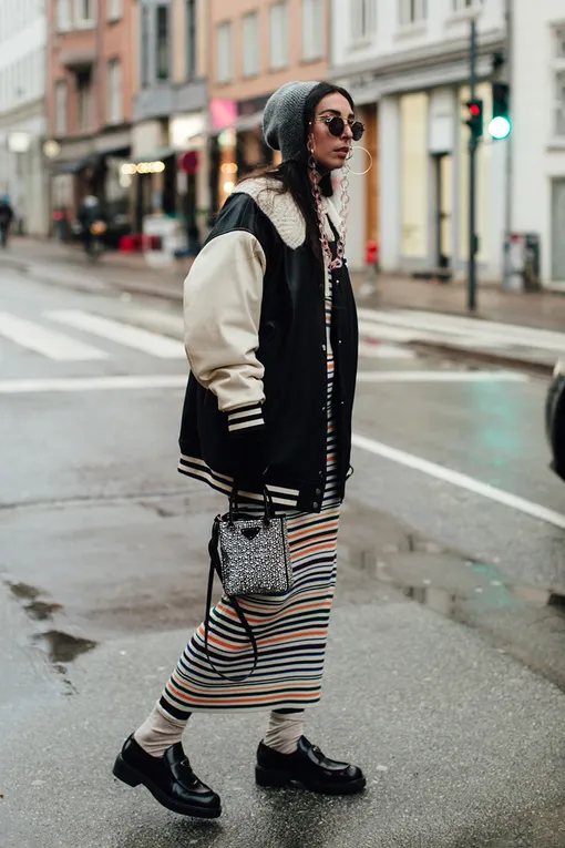 В этом сезоне бомберы захватили модную арену: на пике популярности сейчас находятся кожаные модели, которые так любят Рианна и Хейли Бибер (где их искать и как правильно носить, мы рассказывали здесь). Однако не менее актуален этой весной и классический бомбер — тот самый, что носят капитаны футбольных команд (а по совместительству самые крутые парни) в каждом втором американском фильме. В повседневный гардероб классический бомбер — классическим его делают контрастные рукава и нашивки — действительно пришел из гардероба американских спортсменов, однако сейчас его носят даже с платьями и туфлями на каблуках.