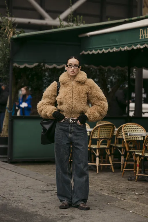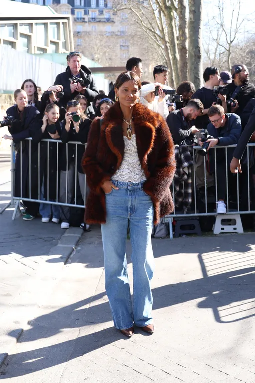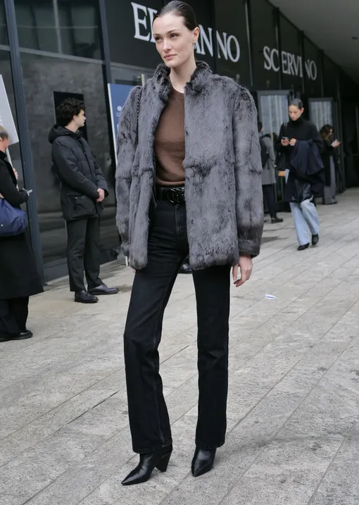 Для начала стоит отметить: шуба может быть любой. И длинной, и укороченной, и объемной. Все решают пропорции. Именно они определяют, какие джинсы подойдут лучше всего. Первый и самый очевидный вариант — выбрать свою любимую пару. Но с поправкой на актуальность. Джеггинсы и чрезмерно обтягивающие варианты давайте оставим в прошлом. Сейчас мода требует немного воздуха в силуэте. И здесь на первый план выходят джинсы-сигареты. Этот крой балансирует между прямым и узким: слегка облегает бедра, но при этом свободно спускается книзу. Еще одна версия, заслуживающая внимания, — джинсы-буткаты. Умеренно расклешенные от колена, они создают мягкий баланс между объемом верха и линией бедра. А если дополнить ансамбль обувью на каблуке, то получатся бесконечно длинные ноги. Не теряют позиций и прямые джинсы — это та самая универсальная опция, которая выручит в любой ситуации. Ключевой момент — посадка. В тренде заниженная талия, создающая легкий намек на ностальгию по Y2K, но если хочется классики, выбирайте среднюю. А высокая талия — беспроигрышный прием для тех, кто хочет лишний раз подчеркнуть длину ног.